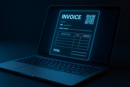 A modern laptop shows a glowing blue digital invoice document on its screen, featuring fields for date, description, quantity, amount, total, and a prominent QR code. The minimalist design against a dark background emphasizes electronic billing, online payments, financial technology, and efficient digital accounting processes in a high-tech environment.
