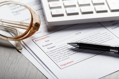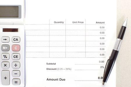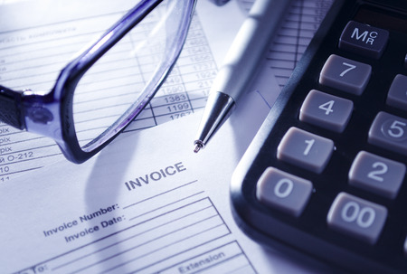 Conceptual Close up of Calculator, Eyeglasses and Ballpoint Pen on Top of Invoice Reports.