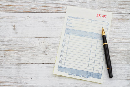 Klang, Malaysia: May 6, 2021- Set paper checks and receipts. A receipt records the sale of goods isolated on a wooden background