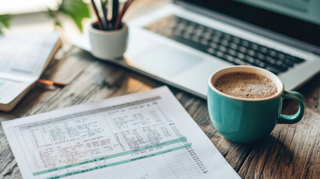 A serene home office setup featuring a green coffee mug, a laptop, and financial documents on a rustic wooden desk, perfect for productivity.