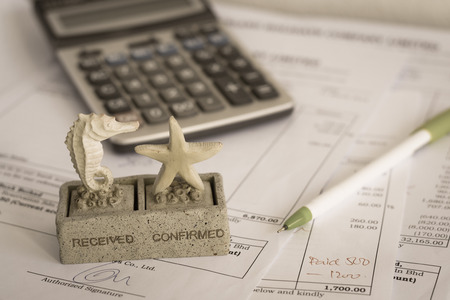 close up received and confirmed rubber stamp on office document with pen and calculator