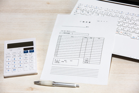 Invoice document stacked on wood table with calculator, pen, smartphone, and laptop. Financial management, business accounting.
