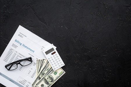 Paying bills. Billing statement near calculator, money, glasses on black background top view.