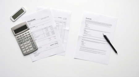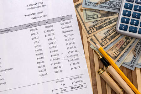 Invoice document stacked on wood table with calculator, pen, smartphone, and laptop. Financial management, business accounting.
