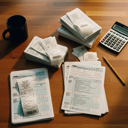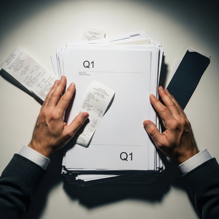 High angle top-down view (flat lay) of hands sorting a chaotic pile of quarterly business receipts a