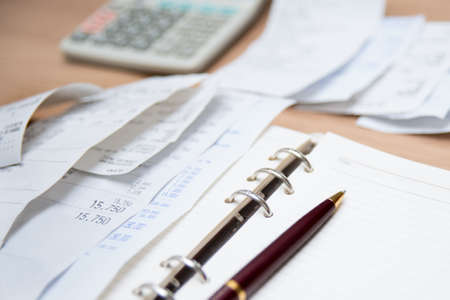 A lot of receipts in paper nail and calculator on the desk, accontancy or tax work concept
