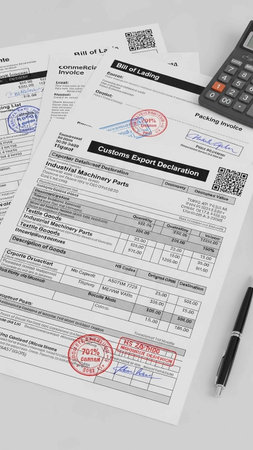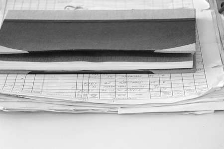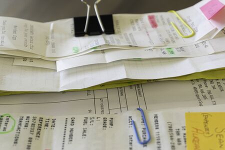 Close-up of a stack of invoices and receipts being neatly organized in a tray.