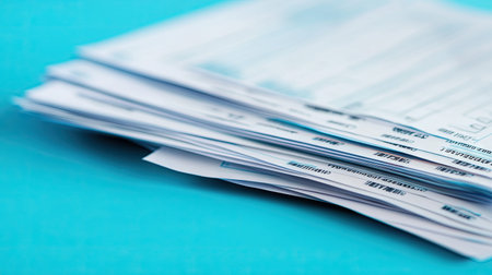 Close-up view of a stack of printed documents on a blue surface. The sheets display lines and text, perfect for backgrounds or project use.