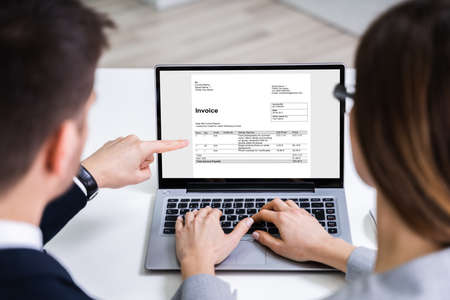 Two Businesspeople Analyzing Invoice On Laptop In Office