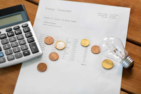 utility bill, calculator, money and lightbulb