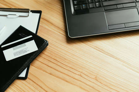 online payment. money transaction and orders. financial operations on the internet. credit or debit bank card and laptop on the desk. free space concept.