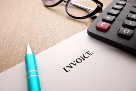 Invoice document stacked on wood table with calculator, pen, smartphone, and laptop. Financial management, business accounting.