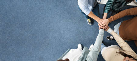 Top view of multiethnic people holding hands together during anonymous alcoholics meeting in rehab center