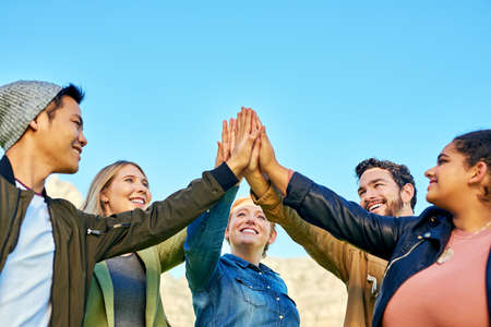 Making a pact to stay friends forever. Low angle shot of a group of friends piling their hands while standing outside.