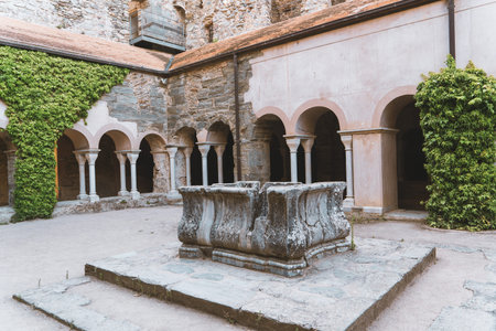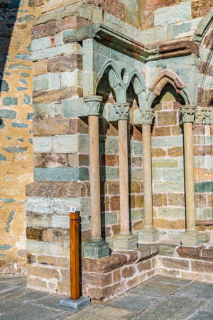 Architectural details at the Sacra di San Michele, one of the most popular tourist attractions in Piedmont region, Italy. Scenic sight of