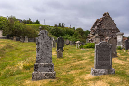 Laide, Scotland - June 8, 2012: Chapel ruin at Laide historic beach side cemetery under gray-blue heavy cloudscape. Brown stones and tomb remnants on grass. Green hills as background.