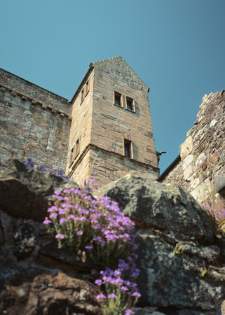 View of an old stone castle tower with purple wildflowers growing on the walls under a clear blue sky in Scotland.