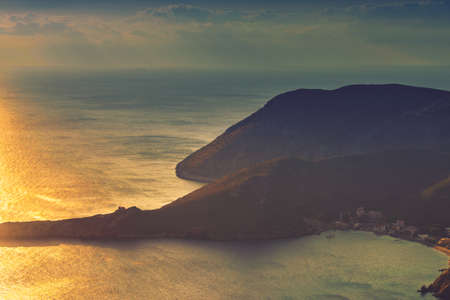 Seascape morning bay with distant mountains, islands and tranquil sea