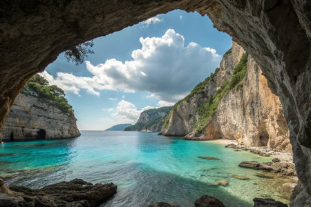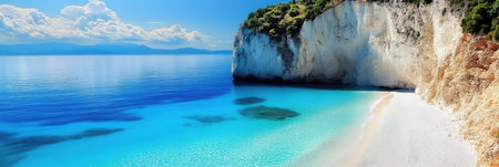 AI Generated. Coastal Cliffs Enclosing a Sandy Cove and Turquoise Water