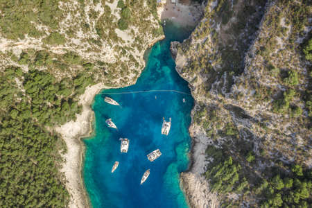 Aerial top down view two yachts stand at sea near white sandy beach Myrtos, Greece