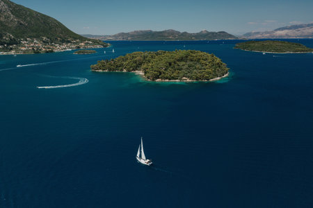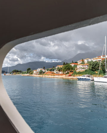 Cruise from Nidri port in Lefkada or Lefkas Greek island, Ionian Sea near Preveza. Summer vacation on boat, cloudy sky.