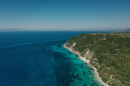 Panoramic view of amazing coastline on Kefalonia Island. Picturesque landscape, colorful Ionian sea, white clouds floating over mountains. Greece