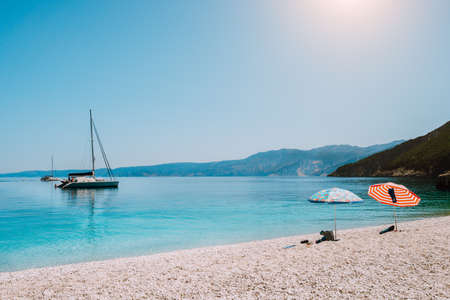 Idyllic white beach with umbrellas on lazy summer day. Sailing boat on calm crystal clear water