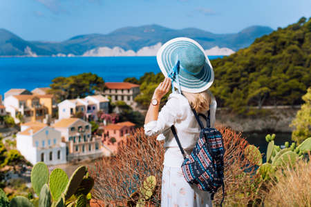 Tourist woman with blue sunhat, white clothes and travel backpack admire view of colorful tranquil village Assos on sunny day. Visiting Kefalonia during summer time on Greece travel vacation