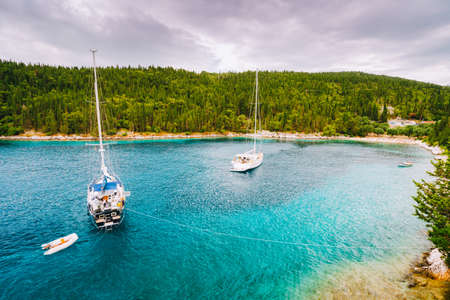 Foki beach near small town Fiskardo at Kefalonia, Ionian islands, Greece. Private yacht boats in the small lagoon.