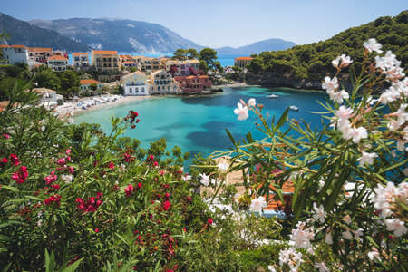 Assos village. Vivid colorful local house buildings close to transparent blue turquoise lagoon. Kefalonia, Greece