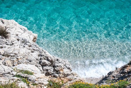 Beautiful landscape with sea bay with turquoise water, rocks and cliffs, green grass and flowers. Corfu Island, Greece.