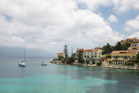 Fiskardo village on the Ionian Island of Kefalonia Greece, summer vacation destination, cloudy sky and beautiful landscape scenery.