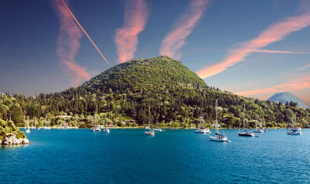 Popular Tourist destination. Bay with boat on Lefkada island. Nydri village.
