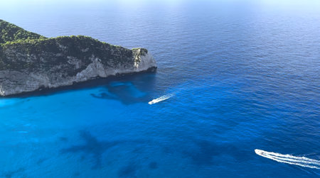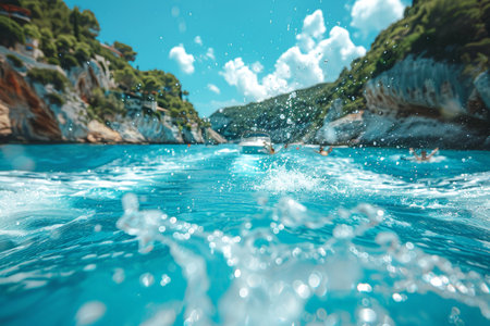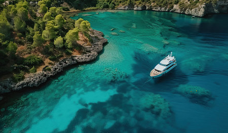 A boat speeding through crystal clear blue water with a scenic coastal background, capturing the essence of summer adventure and freedom. POV Point of View shooting trend. With Generative AI technology.