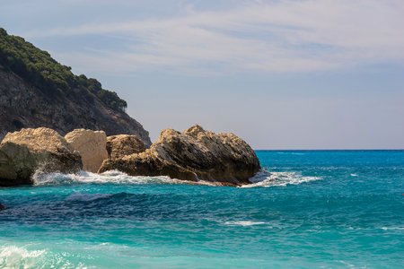 Rocks in the blue waters of Megali Petra Beach, Lefkada, Ionian Islands, Greece