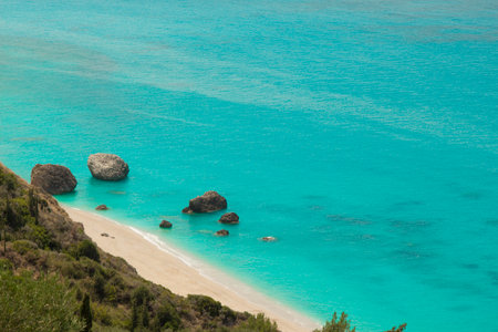 Beautiful crystal clear azure water at Antisamos beach on Kefalonia island, Greece. Beautiful sea bay with Antisamos beach on Kefalonia island, Ionian island, Cephalonia, Antisamos beach, Greece.