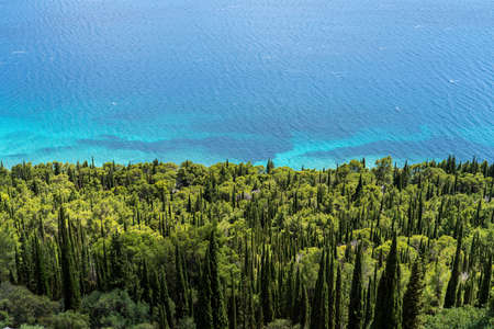 Beautiful Phoki Beach surrounded by cypress trees in the evening sunlight. Amazing seascape of Ionian Sea. Cypress shadows on the clear azure water. Greece