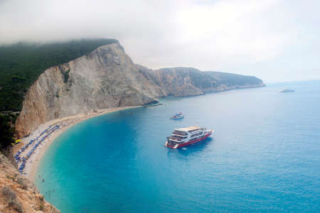 Porto Katsiki Beach in Lefkada island boat and foggy sky