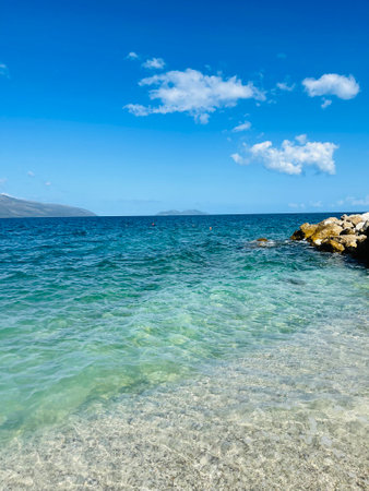 Rocky beach and crystal turquoise water of Ionian Sea in Albania.
