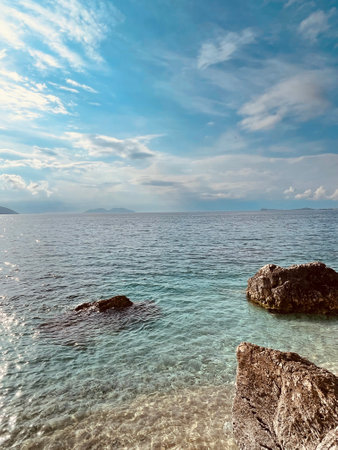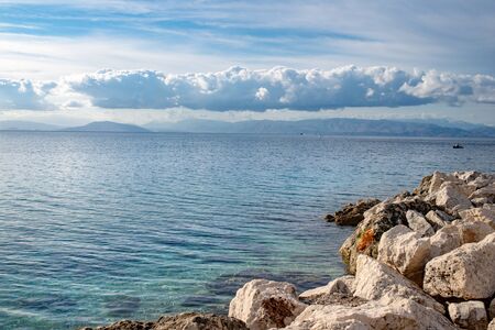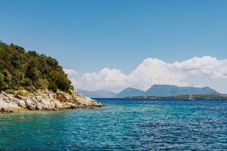 Amazing bay with crystal clear water and big stones on Corfu island, Greece. Beautiful landscape of Ionian sea beach. Sunny weather, blue sky.