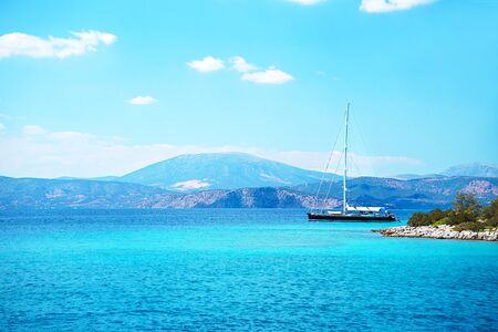 Yacht boat in Agiofili beach near port of Vasiliki with emerald crystal clear sea, Lefkada island, Ionian, Greece