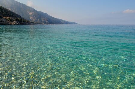 Beautiful seascape. Calm sea with clear water. With mountain and blue sky
