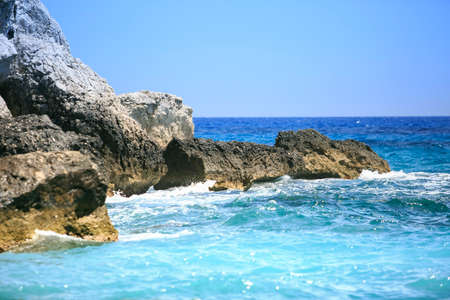 Kavalikefta beach, Lefkada island, Greece. Rocky beach and clear turquoise blue sea on a sunny summer day, close up. Vintage toned image