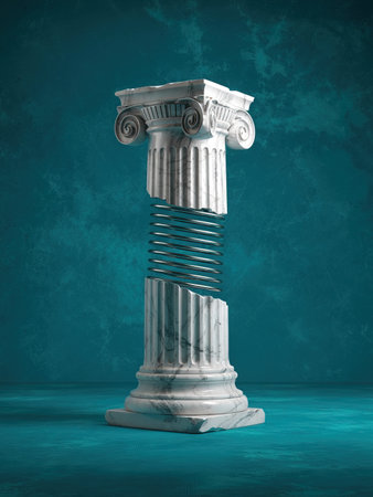 Isolated close up shows a marble Ionic column split in two and connected with a steel spring set against a textured teal background offering a surreal artistic view.