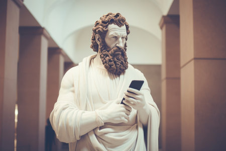 Ancient Greek god statue in museum, sculpture of man in robe using smartphone, technology concept