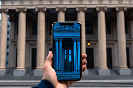This image captures a miniature bank model alongside a smartphone displaying a banking interface, symbolizing the fusion of traditional finance and digital innovation.