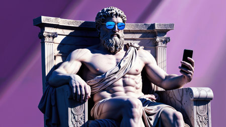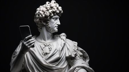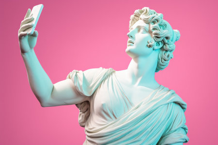Antique statue takes selfie with mobile phone. Generative AI illustration
