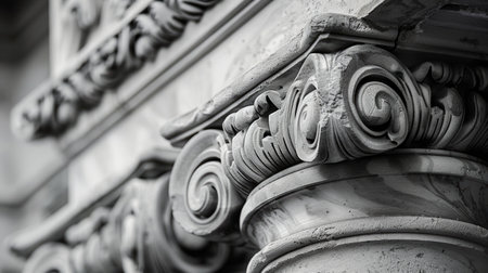 A detailed close-up captures the weathered texture of an ancient stone spiral, part of a classical column's capital.