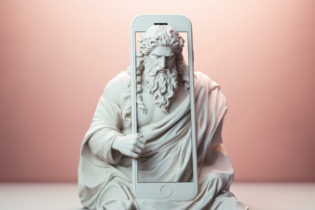 Greek god statue on smartphone, minimalist monochrome studio shot, with copy space