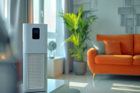 air purifier a living room, air cleaner removing fine dust in house. protect PM 2.5 dust and air pollution concept
